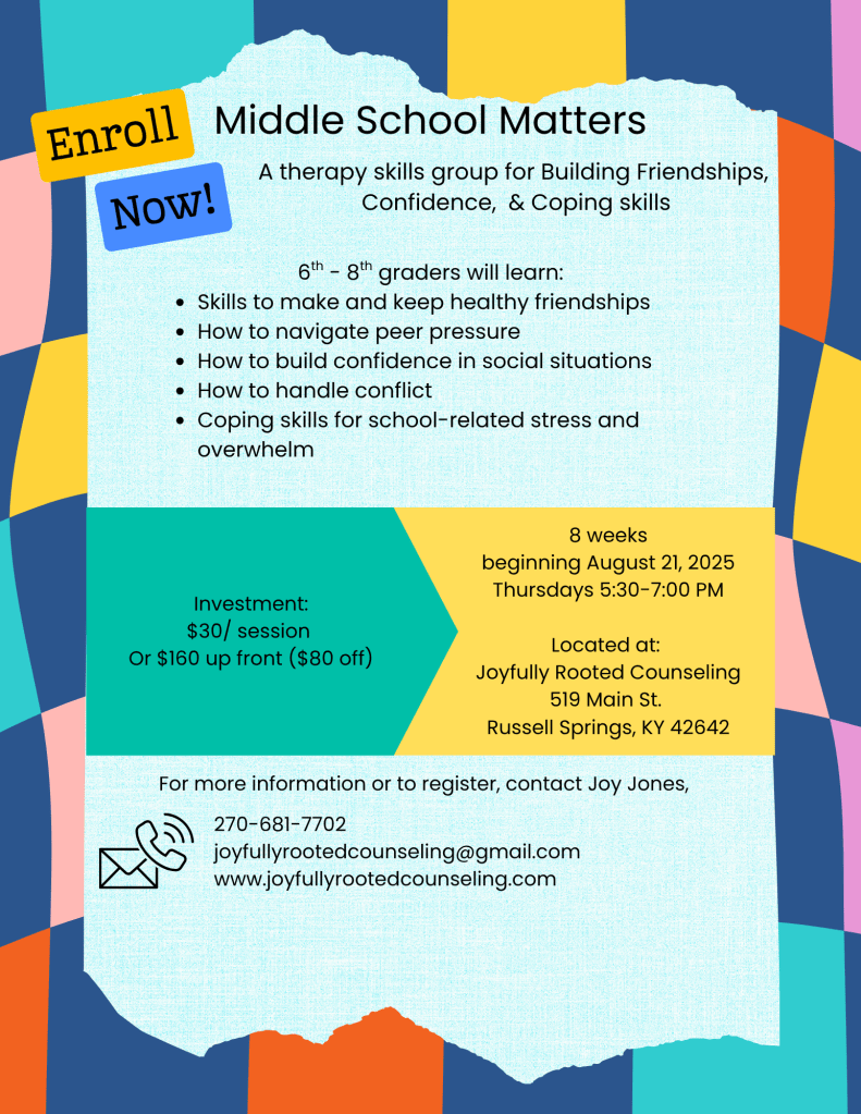 - Middle school is a big deal – new faces, new expectations, and new pressures. This 8-week group helps middle schoolers develop the skills and confidence to thrive socially and emotionally during this major transition. This group is interactive, age-appropriate, and designed to be fun and supportive.